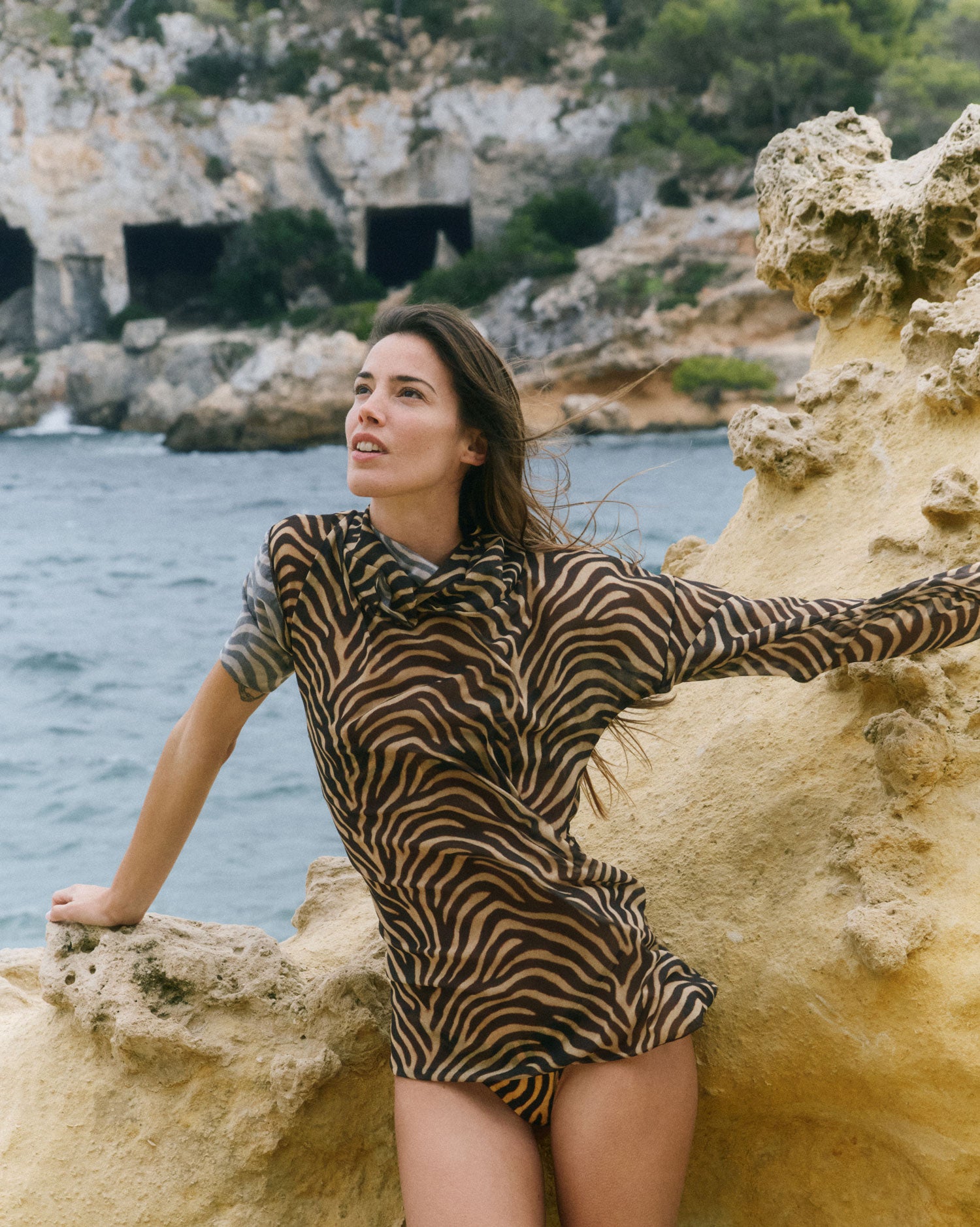 Hooded cover-up with cowl neck in a sheer and lightweight fabric featuring our exclusive zebra print.
